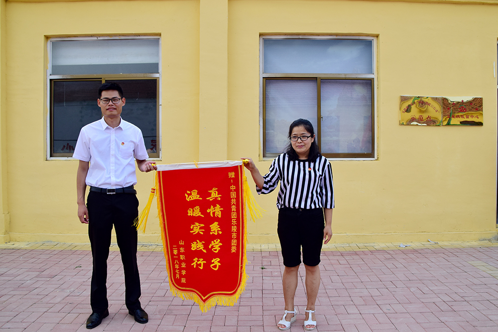 在此次“三下乡”实践活动中, 乐陵市团委为“知行共进”社会实践服务队的师生们提供了极大的支持与帮助,在乐陵市团委的帮助下,服务队在樊屯村365暖留中心建立了青年志愿者服务基地,乐陵市电视台也对此次社会实践活动进行了全面报道。7月12日,冯国英带领队员们向乐陵市团委赠送“真情系学子,温暖实践行”锦旗以示感谢。