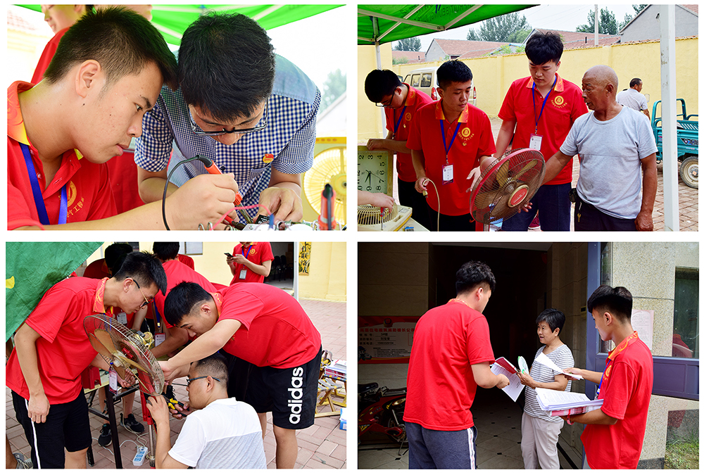 锤炼专业技能,真情服务社会。螺丝刀,万用表,电烙铁,试电笔……简单的工具在维修队员的手中发挥着最大的作用。“知行共进”社会实践服务队赴乐陵市郑店镇樊屯村为村民免费维修家电。队员们运用自己在校学习专业知识,娴熟地拆换、修理电风扇、电视机、电水壶等损坏的各种家用电器,汗水早已浸湿衣衫,但却丝毫不减他们维修的热情。大家在各自的岗位上认真负责,任劳任怨,待人热情大方,工作耐心细致,始终把辛苦埋藏在心底,把热情洋溢展现在脸上,圆满完成维修服务的各项工作任务。看到村民脸上流露出的满意笑容,队员们从心里感到欣慰和高兴。