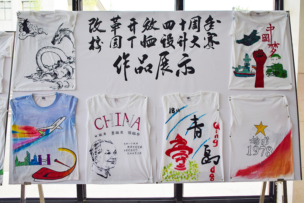 神舟玉兔天宫,高铁支付宝共享单车,世博会奥运会青岛峰会……13件手绘T恤围绕40年来家与国紧密相连的生活变化和时代变迁,以小见大,见微知著,讲述改革开放中发生的精彩故事,展现文明古国的历史文化,讴歌英雄人物的丰功伟绩,赞颂美好生活的和谐安宁,诠释了青年学子对改革开放40年的深刻理解和对青春中国梦的美好憧憬。