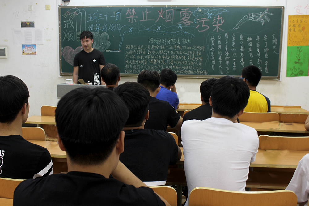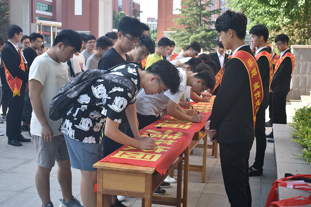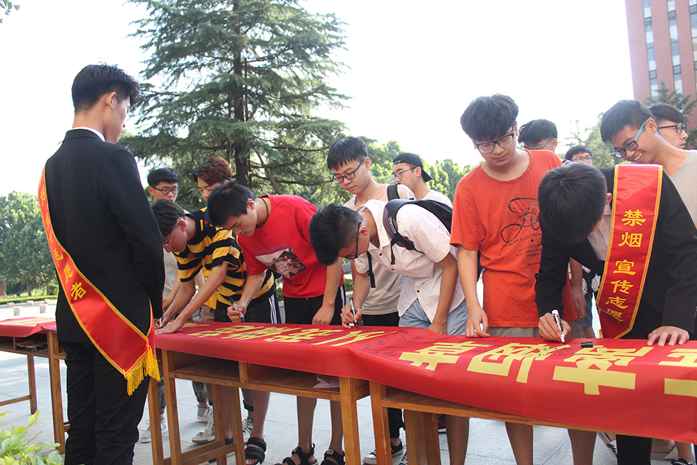 5月31日,禁烟宣传志愿者开展了“禁烟从我做起,建设文明校园”宣誓活动,誓言从自身做起、从现在做起,远离烟草,共同创建无烟校园、清新校园。系党总支书记吕鹏、学工办主任栾金志、团总支书记张锦带头在禁烟横幅上签名。同学们也纷纷表示,要以实际行动来践行倡议,向烟草说“不”,为营造“清新、文明、健康”的校园环境贡献自己的力量。学生自律会还组织禁烟志愿者在教学楼、公寓楼执勤,宣传、督查禁烟落实情况,巡视公共区域。