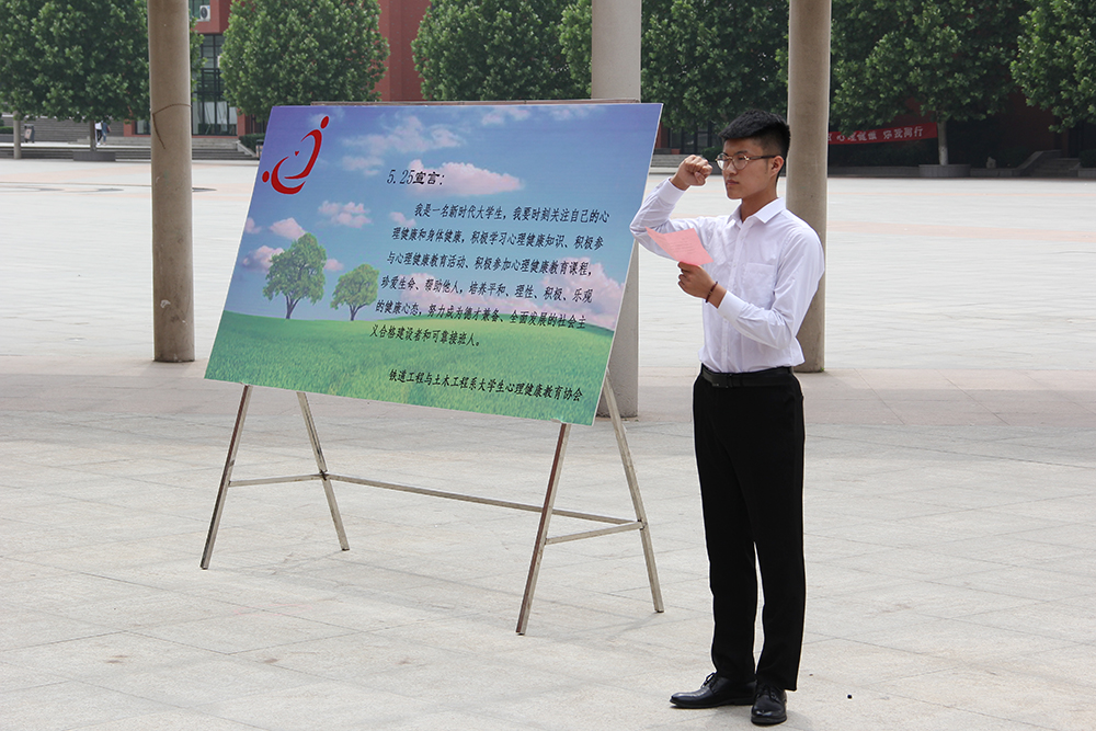 5月25日,铁道工程与土木工程系举办了5·25宣言宣誓活动。同学们一致表示,一定会将心理健康誓词铭记于心并转化为实际行动,树立正确心理健康的意识,用真诚为心灵注入温暖。今年以来,铁道工程与土木工程系举办了一系列有益于学生身心健康的活动,深受学生的喜爱。此次举办5·25宣言宣誓活动,是对整个心理健康节活动的巩固和升华,使广大同学深刻认识到心理健康教育的重要性。