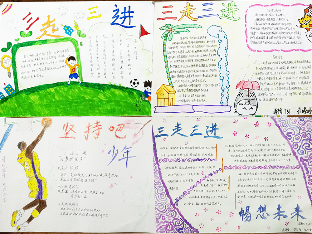 各方位广宣传。对外通过官方微信推出“三走三进”专题微信活动,让同学们在互动中了解“三走三进”是什么,“三走三进”具体该怎么做;对内通过绘制“三走三进”主题手抄报,引导同学们树立“三走三进”意识。